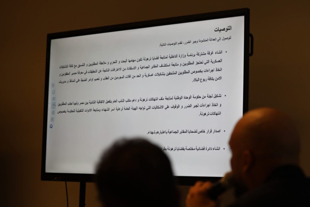 وتم خلال الطاولة المستديرة إجراء تقييم للتقدم المحرز منذ صدور تقرير بعثة الأمم المتحدة ومفوضية الأمم المتحدة السامية لحقوق الإنسان حول المقابر الجماعية والانتهاكات المرتكبة في ترهونة، و ناقش المشاركون أبرز التحديات التي لا تزال تواجه مسار العدالة، ومن أهمها توقف أعمال استخراج الجثث من المقابر الجماعية لما يقارب العامين، وهو ما يعيق التحقيقات ويؤثر على حفظ أدلة الحمض النووي الضرورية للتعرف على الضحايا، إضافة إلى استمرار حالات الإفلات من العقاب وهروب بعض المتهمين أو انضمامهم إلى تشكيلات أمنية دون اتخاذ إجراءات قانونية رادعة.