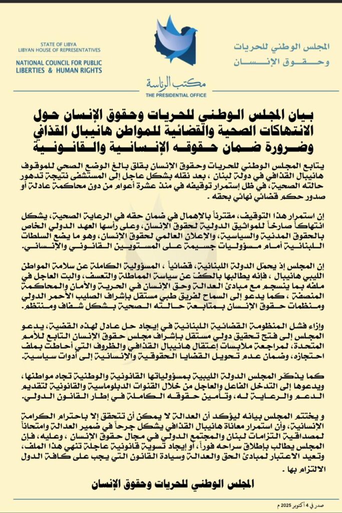 بيان المجلس حول الانتهاكات الصحية والقضائية للمواطن “هانيبال القذافي” وضرورة ضمان حقوقه الإنسانية والقانونية .