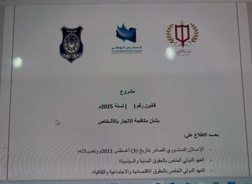 وقد استعرضت اللجنة خلال اجتماعها المكونات الجوهرية للمسودة الأولية لمشروع القانون الوطني لمكافحة الاتجار بالبشر، الذي يجري إعداده بما يتماشى مع بروتوكول الأمم المتحدة لمنع وقمع ومعاقبة الاتجار بالأشخاص، وبخاصة النساء والأطفال، المكمِّل لاتفاقية باليرمو لعام 2000م، وبما يعكس التزام الدولة الليبية الثابت بمواءمة تشريعاتها مع أطر التعاون الدولي ذات الصلة بمكافحة الاتجار بالبشر، وتطوير الآليات الوطنية بما يكفل تكامل الأدوار بين الجهات العدلية والأمنية والحقوقية، ويُعزز منظومة الحماية القانونية للضحايا ويضمن عدم إفلات الجناة من المساءلة.