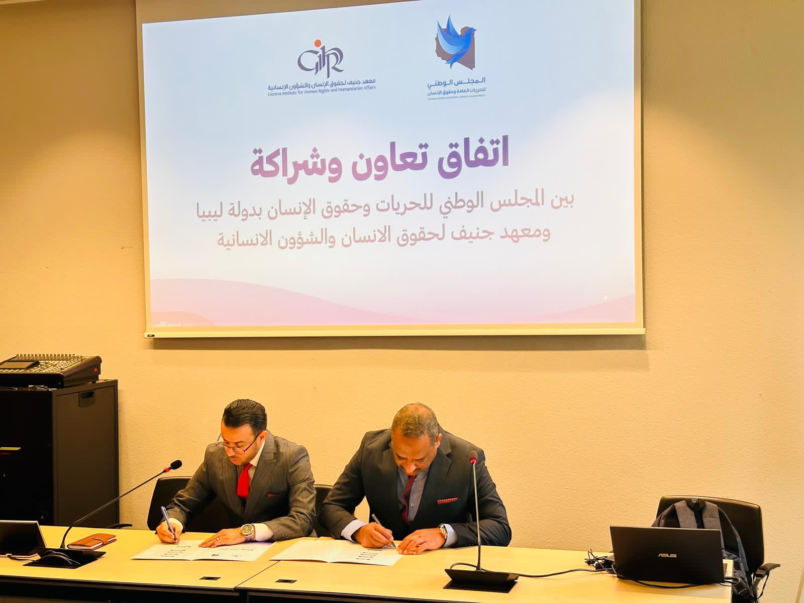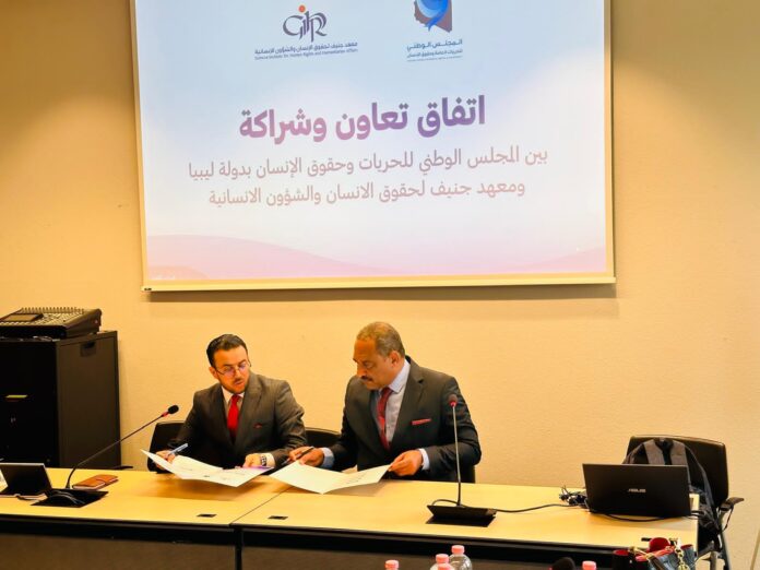في إطار تعزيز وتطوير علاقاته في الاطار الدولي في مجالات حقوق الإنسان، وقّع المجلس الوطني للحريات وحقوق الإنسان اليوم الثلاثاء11 نوفمبر 2025، بمدينة جنيف السويسرية، اتفاق تعاون وشراكة مع معهد جنيف لحقوق الإنسان والشؤون الإنسانية، وذلك بمقر المعهد بجنيف ، وقّع الاتفاقً عن المجلس الأستاذ “عبدالمولي رمضان أبونتيشة”، رئيس المجلس المكلف، وعن معهد جنيف لحقوق الإنسان والشؤون الإنسانية الدكتور “نزار عبدالقادر صالح” المدير التنفيذي للمعهد.