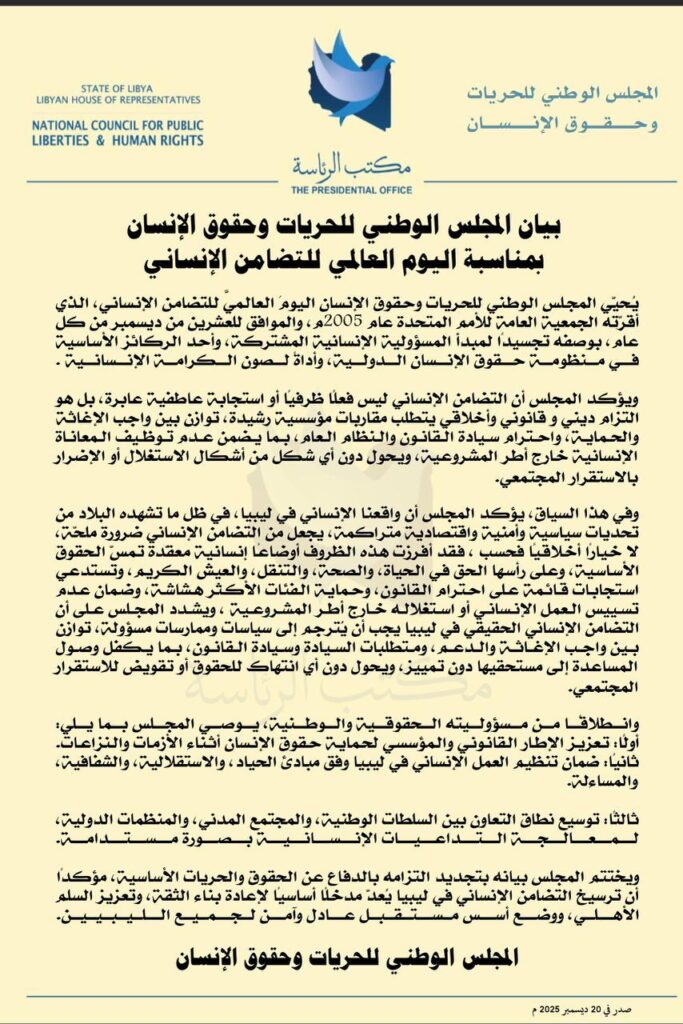 ويختتم المجلس بيانه بتجديد التزامه بالدفاع عن الحقوق والحريات الأساسية، مؤكدا أن ترسيخ التضامن الإنساني في ليبيا يعد مدخلاً أساسياً لإعادة بناء الثقة، وتعزيز السلم الأهلي، ووضع أسس مستقبل عادل وآمن لجميع الليبيين.