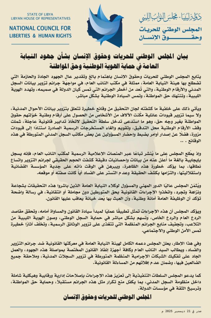 بيان المجلس الوطني للحريات وحقوق الإنسان بشأن جهود النيابة العامة في حماية الهوية الوطنية وحق المواطنة .