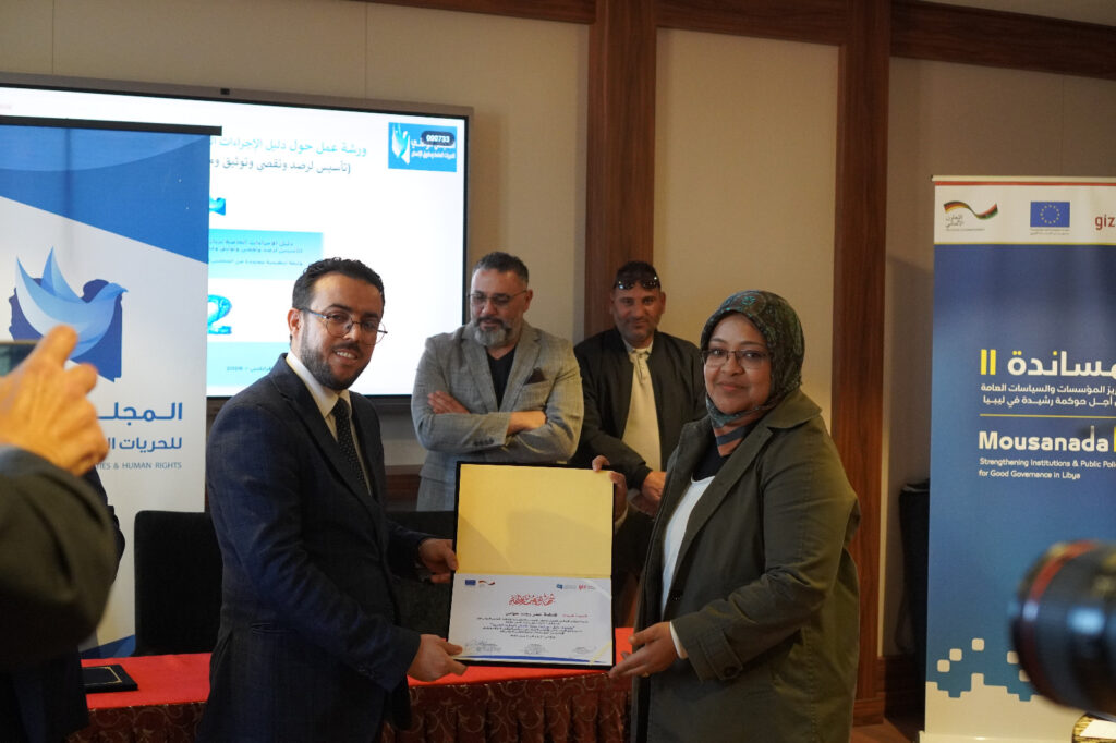 وشهدت فعاليات الاختتام حضور المكلف بتسيير أعمال المجلس الوطني للحريات وحقوق الإنسان الأستاذ “عبدالمولى رمضان أبونتيشة” إلى جانب خبراء من المؤسسة الألمانية للتعاون الدولي (GIZ)، ومشاركة فاعلة من منتسبي الورشة التي ضمت خمسةً وعشرين مشاركًا من موظفي المجلس بمناطقه الخمسة (الشرق، الغرب، الجنوب، الوسط، ومنطقة الساحل الغربي)، إضافة إلى عدد من موظفي ديوان المجلس، وممثلين عن عدد من الجهات الوطنية ذات العلاقة، من بينها وزارة العدل وجهاز الشرطة القضائية ووزارة الداخلية والهيئة العامة لصندوق التضامن الاجتماعي واللجنة العليا للطفولة، بما يعكس نهج الشراكة المؤسسية وتكامل الأدوار الوطنية في دعم منظومة حماية وتعزيز حقوق الإنسان بليبيا.