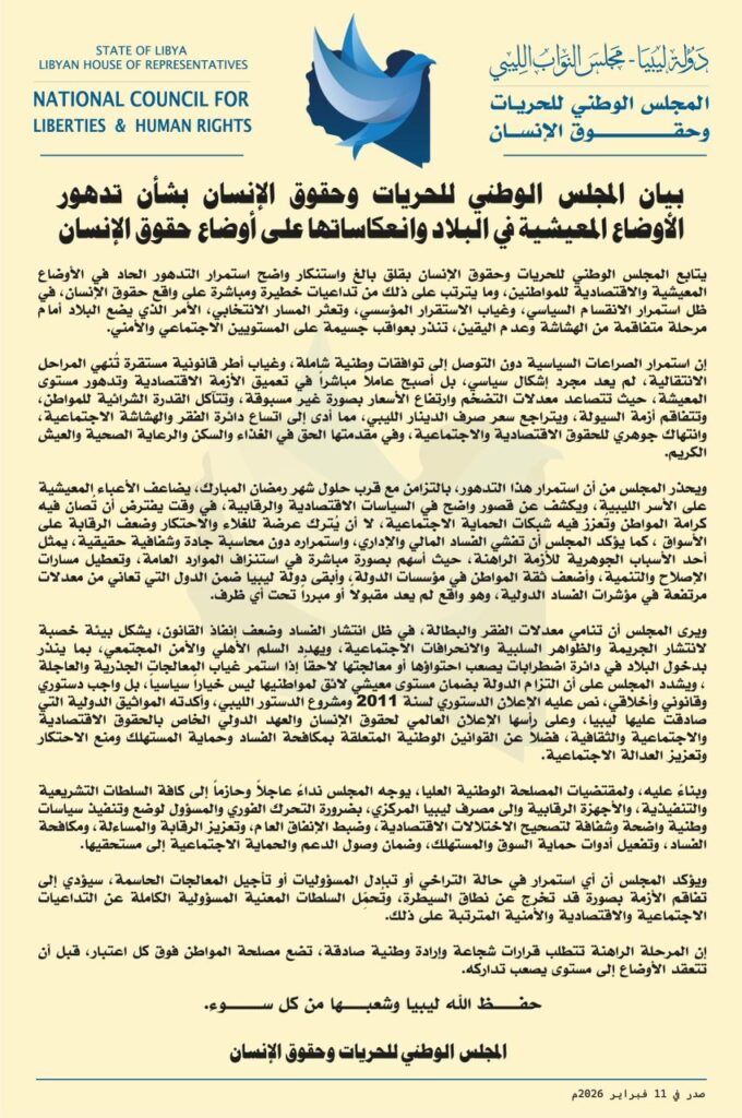 وبناءً عليه، ولمقتضيات المصلحة الوطنية العليا، يوجه المجلس نداءً عاجلًا وحازمًا إلى كافة السلطات التشريعية والتنفيذية، والأجهزة الرقابية، وإلى مصرف ليبيا المركزي، بضرورة التحرك الفوري والمسؤول لوضع وتنفيذ سياسات وطنية واضحة وشفافة لتصحيح الاختلالات الاقتصادية، وضبط الإنفاق العام، وتعزيز الرقابة والمساءلة، ومكافحة الفساد، وتفعيل أدوات حماية السوق والمستهلك، وضمان وصول الدعم والحماية الاجتماعية إلى مستحقيها.