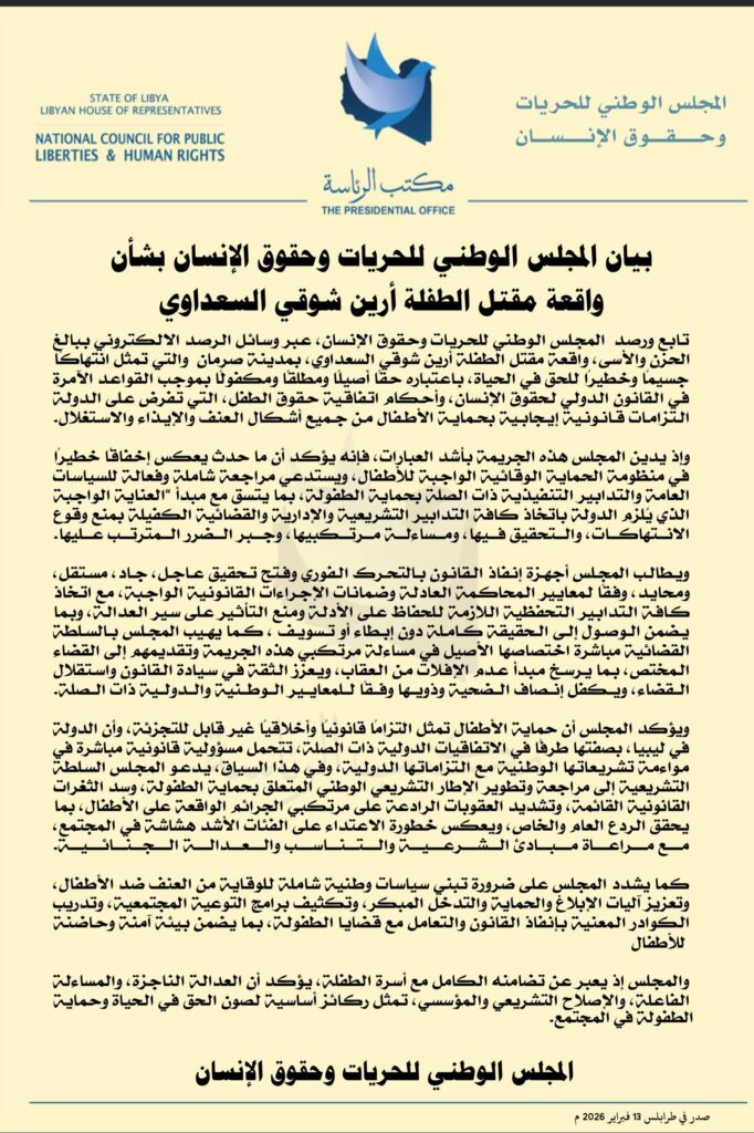 تابع ورصد المجلس الوطني للحريات وحقوق الإنسان، عبر وسائل الرصد الإلكتروني، وببالغ الحزن والأسى، واقعة مقتل الطفلة “أرين شوقي السعداوي” بمدينة صرمان، والتي تمثل انتهاكًا جسيمًا وخطيرًا للحق في الحياة، باعتباره حقًا أصيلًا ومطلقًا ومكفولًا بموجب القواعد الآمرة في القانون الدولي لحقوق الإنسان وأحكام اتفاقية حقوق الطفل، التي تفرض على الدولة التزامات قانونية إيجابية بحماية الأطفال من جميع أشكال العنف والإيذاء والاستغلال.