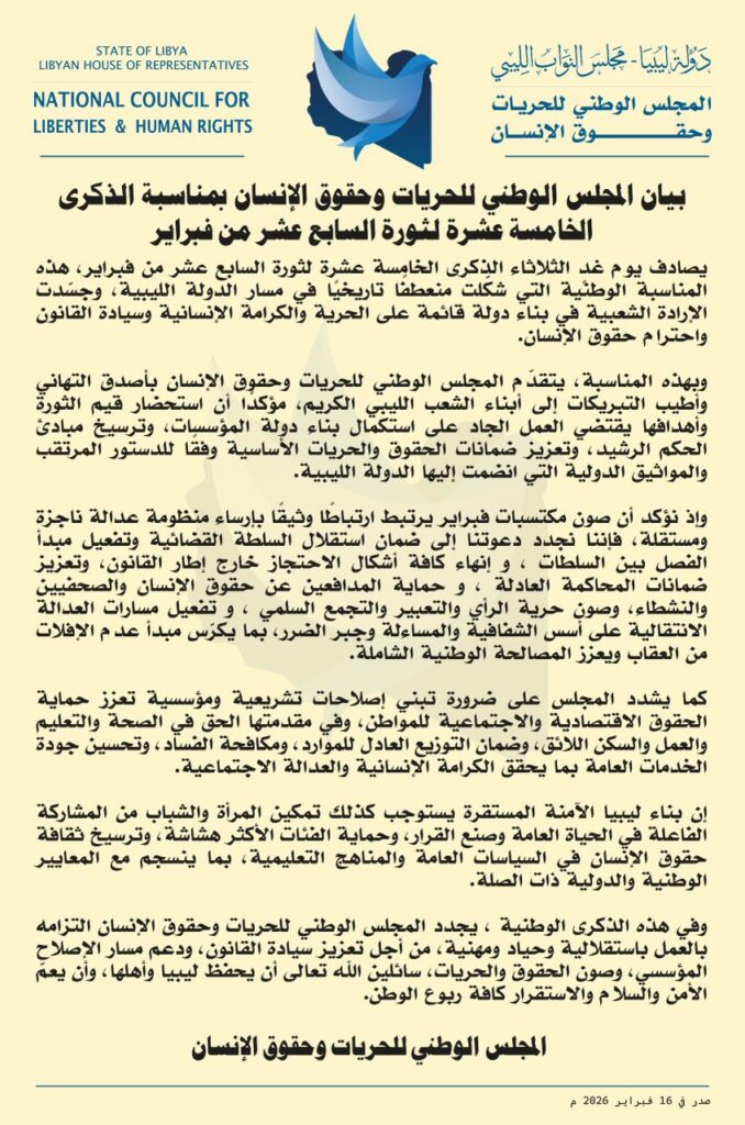 وبهذه المناسبة، يتقدّم المجلس الوطني للحريات وحقوق الإنسان بأصدق التهاني وأطيب التبريكات إلى أبناء الشعب الليبي الكريم، مؤكدًا أن استحضار قيم الثورة وأهدافها يقتضي العمل الجاد على استكمال بناء دولة المؤسسات، وترسيخ مبادئ الحكم الرشيد، وتعزيز ضمانات الحقوق والحريات الأساسية وفقا للدستور المرتقب والمواثيق الدولية التي انضمت إليها الدولة الليبية.