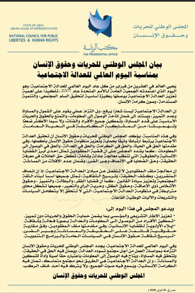 وفي اليوم العالمي للعدالة الاجتماعية، يجدد المجلس الوطني للحريات وحقوق الإنسان التزامه بمواصلة العمل من أجل مجتمع تسوده العدالة، ويُصان فيه الحق في الحقيقة، وتتحقق فيه المساواة، ويُتاح فيه الوصول إلى المعلومات باعتباره حقاً أصيلاً وأداة للتمكين والمساءلة. وإن العدالة الاجتماعية هي الطريق نحو مجتمع متماسك، تُصان فيه الكرامة الإنسانية، ويُسمع فيه صوت الجميع، ولا يُترك فيه أحد خلف الركب.