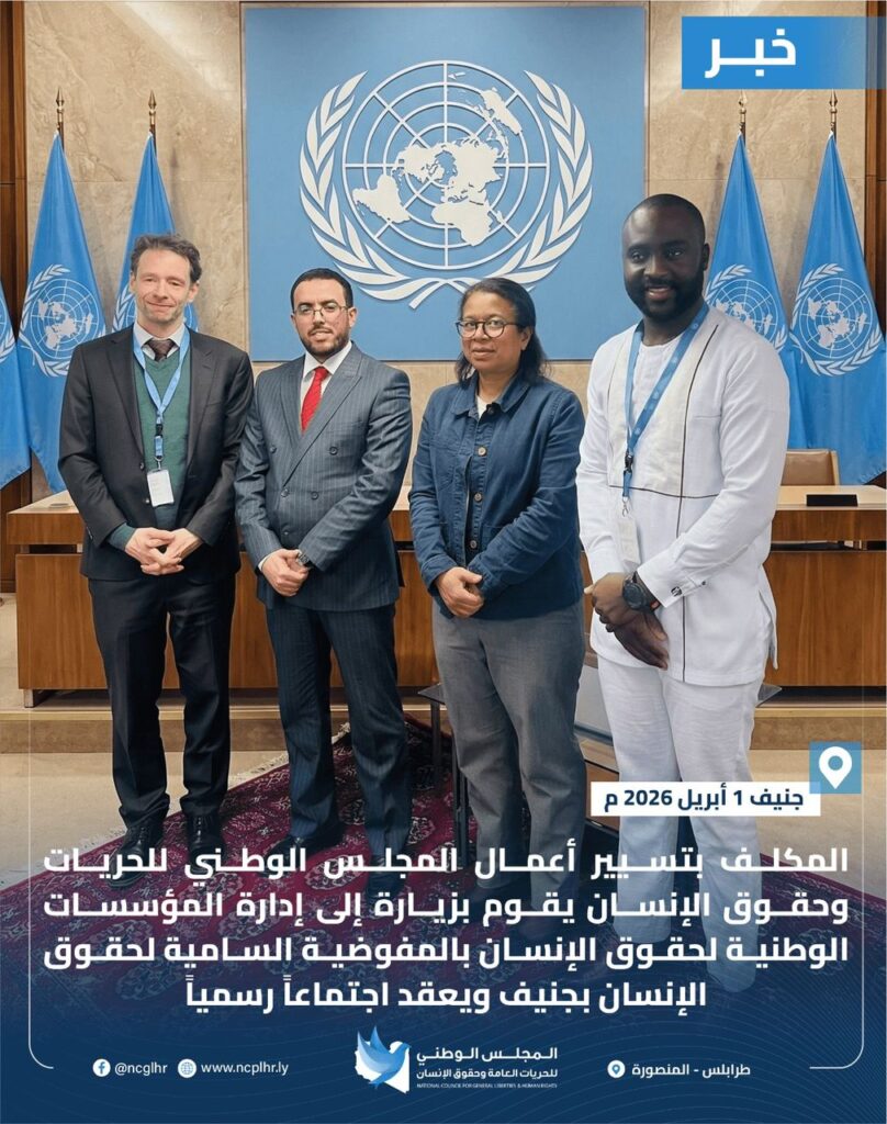 عقد الأستاذ “عبدالمولي أبونتيشة” المكلّف بتسيير أعمال المجلس الوطني للحريات وحقوق الإنسان، اجتماعاً رسمياً مع مسؤولي إدارة المؤسسات الوطنية والآليات الإقليمية التابعة لـ Office of the United Nations High Commissioner for Human Rights، وذلك على هامش مشاركته في الاجتماع السنوي لـ Global Alliance of National Human Rights Institutions المنعقد يومي 31 مارس و1 أبريل 2026 في Palais des Nations بمدينة Geneva.
