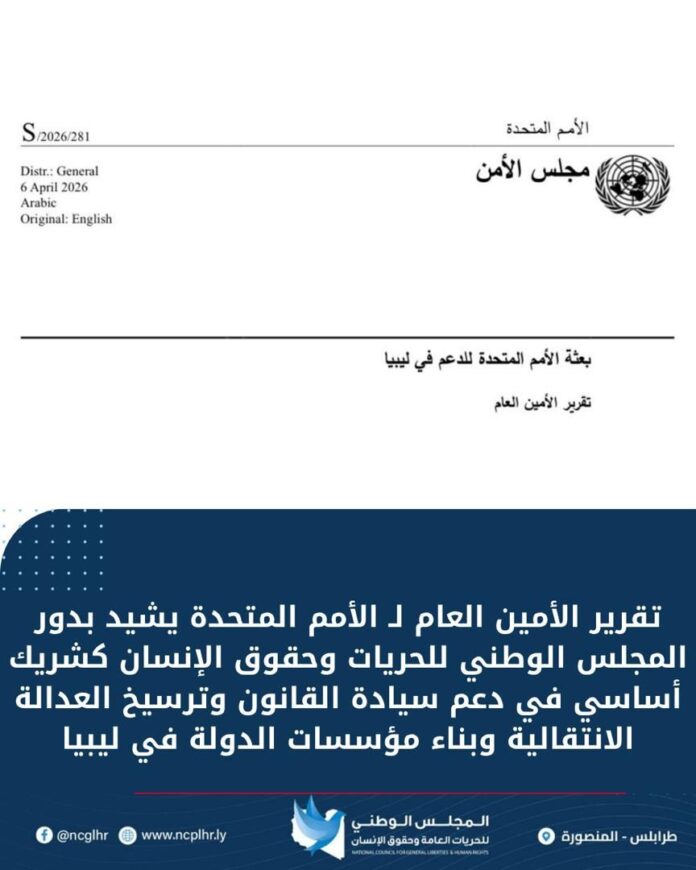 تقرير الأمين العام لـ الأمم المتحدة يشيد بدور المجلس الوطني للحريات وحقوق الإنسان كشريك أساسي في دعم سيادة القانون وترسيخ العدالة الانتقالية وبناء مؤسسات الدولة في ليبيا